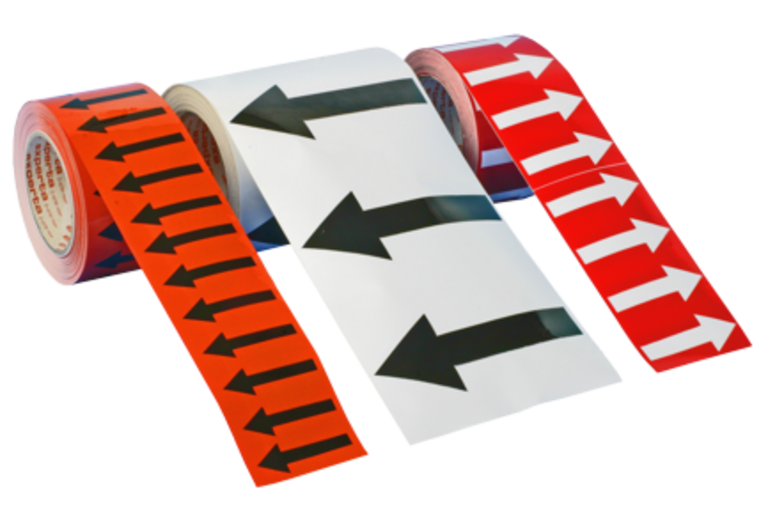 Die Fließrichtungsbänder sind in 33 Meter langen Rollen erhältlich und bieten eine variable Bandbreite von 25mm bis 150 mm. Die vielfältigen Farboptionen sind nach Stoffgruppen sortiert, um eine noch genauere Kennzeichnung zu ermöglichen. Auch hier ist eine Hitzebeständigkeit bis 120°C gegeben.