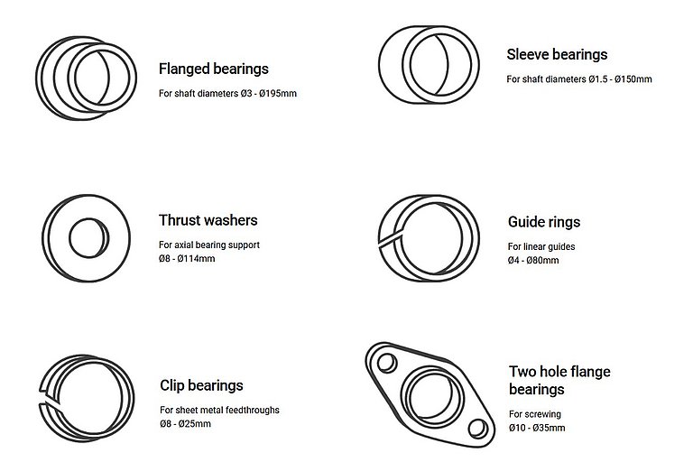 Disponibile intr-o varietate extinsa de tipuri si dimensiuni, lagarele de alunecare fara gresare pot fi integrate cu usurinta intr-o gama larga de aplicatii. Materialele special dezvoltate permit utilizarea acestora in conditii solicitante, inclusiv in medii cu temperaturi ridicate, expunere la substante chimice sau sarcini mecanice importante. In plus, anumite variante sunt potrivite pentru aplicatii cu contact alimentar, respectand cerintele stricte din industrii precum cea alimentara sau farmaceutica.