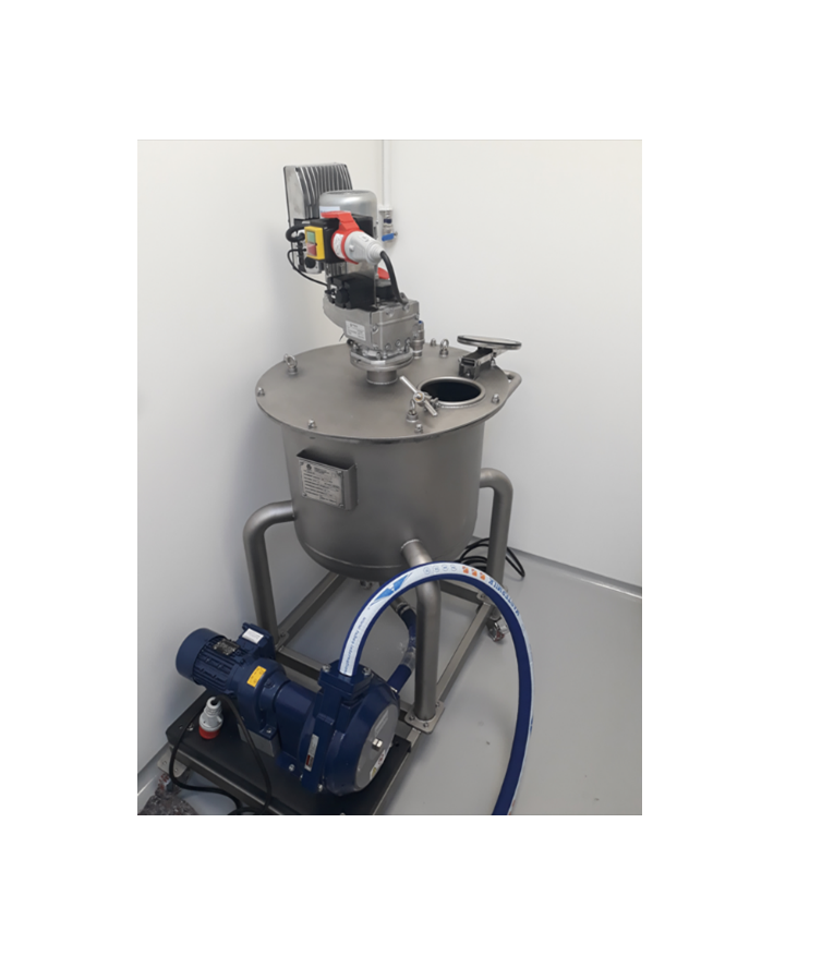 Podczas rozmów z klientem pojawił się problem opróżniania zbiornika z gotowym produktem. Wówczas zaproponowaliśmy rozbudowę całego układu. Zbiornik został zaprojektowany na nowo, wyposażony w podstawę jezdną i naszą pompę perystaltyczną od producenta Ponndorf.