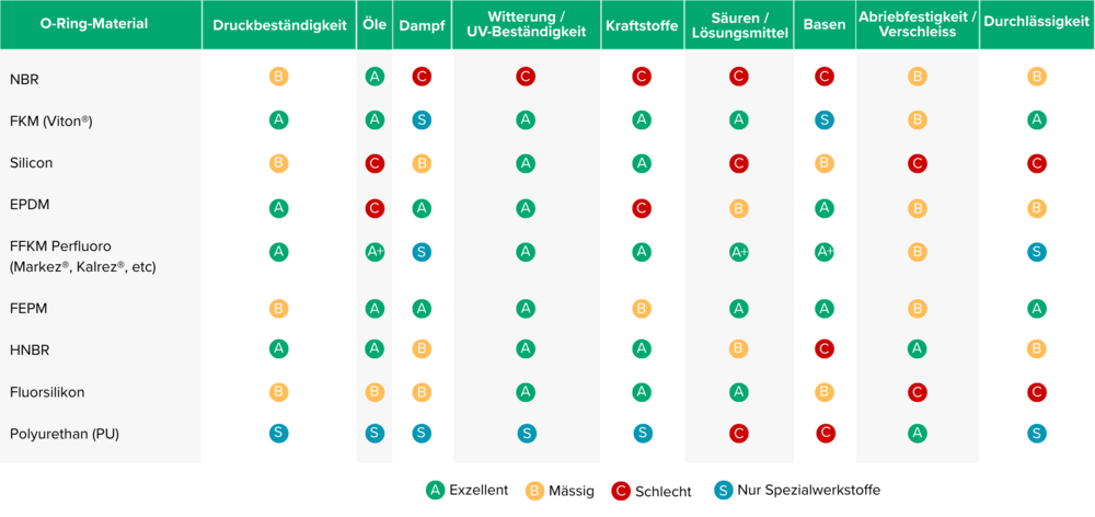 Damit ermöglicht diese Übersicht eine klare Auswahl des passenden O-Ring-Materials für den jeweiligen Einsatzfall.