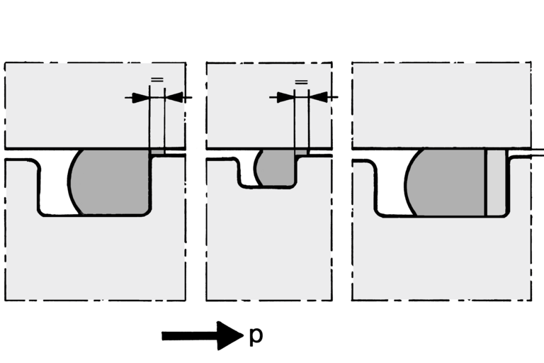 Durch Druck wird der O-Ring an die druckabgewandte Nutflanke gepresst. Um zu vermeiden, dass der O-Ring dabei in den Dichtspalt (F) gedrückt wird, soll dieser möglichst klein gehalten werden. Besonders bei erhöhten und pulsierenden Systemdrücken besteht die potenzielle Gefahr der "Spaltextrusion". Diese Extrusion kann dazu führen, dass die Dichtung rasch beschädigt wird. Daher spielt die Einhaltung des maximalen Dichtspalts eine entscheidende Rolle bei der Vorbeugung möglicher Probleme.