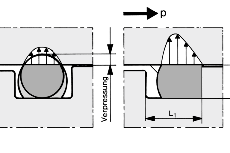 O-Ringe agieren als eigenständige Dichtungen, die ihre Dichtwirkung durch die Verformung ihres kreisförmigen Profils erreichen. Dieser Verformungsgrad wird maßgeblich von der Nuttiefe „S“ bestimmt, also der Tiefe der Nut, in die der O-Ring eingesetzt wird. Die resultierenden Anpresskräfte, die wir auch als „Verpressung“ oder „Vorspannung“ bezeichnen, erfahren eine zusätzliche Überlagerung durch den Systemdruck. Mit steigendem Betriebsdruck erhöht sich somit die auf den O-Ring ausgeübte Gesamt-Dichtpressung.