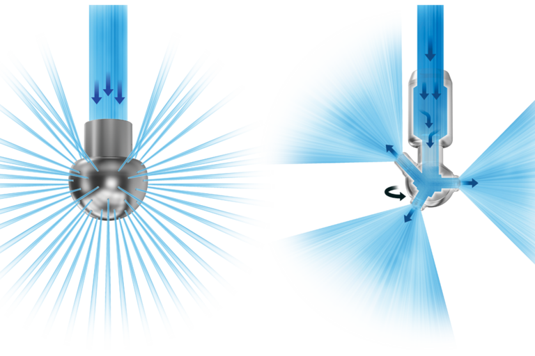 - дизайн на дюзата - плътноструйни дюзи с контролирано въртене по две оси, осигуряващи директен удар по цялата повърхност на съда