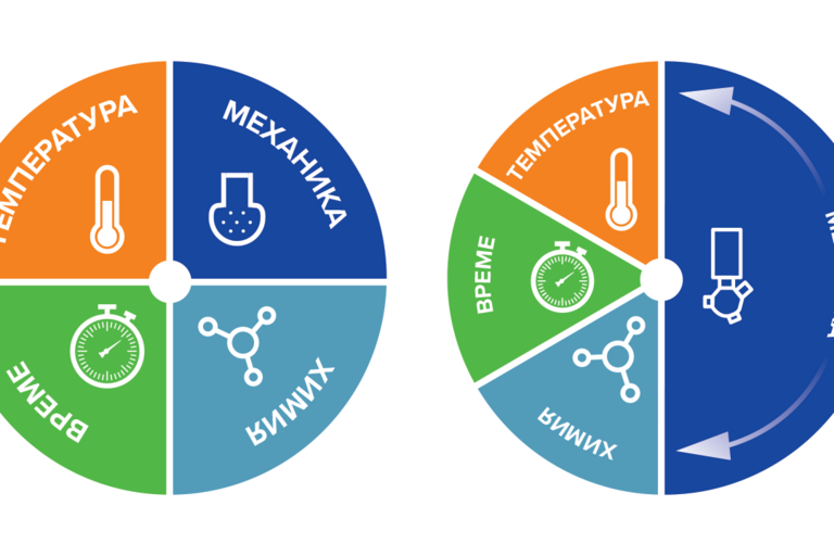 Тези четири фактора образуват т.нар. “порочен кръг” на измиването. Заедно формират 100% от усилията за измиване. За всеки процес факторите могат да се променят, като неминуемо влияят един на друг. Миещата глава може да повлияе на механичния фактор. Ако един резервоар може да бъде измит с равни дялове химия, механика, температура и време, само с промяната на вида миеща глава може да се намали значително времето за измиване и/или консумацията на химикал, и/или температурата - всеки фактор в различни измерения, но с един общ резултат: икономия.
