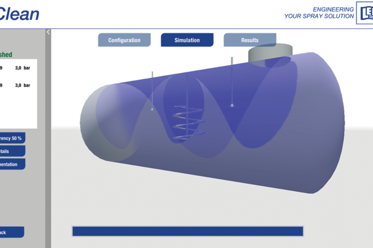 Симулацията започва с въвеждане размерите на съда, поставяне на връзки и отвори (люкове, дренажи, кранове), поставяне на бъркалка с нейните размери, продължава с избор на място на монтаж, брой и вид миещите глави и завършва с визуализация на измитите зони, както и информация за успеваемост на измиването от директен удар и от обливане. Цялата тази информация се предоставя като доклад от няколко страници, който аргументира избора на съответния клас и модел миеща глава.