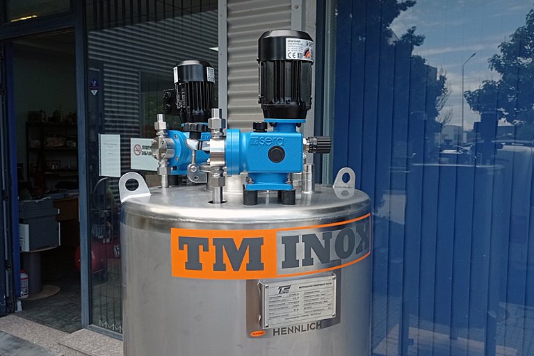 След подробни уточнения на необходимите технологични връзки на резервоара изготвихме проектно предложение с детайлен чертеж на резервоар с две помпи и нивосигнализатор. Поддържайки близка връзка с клиента и следвайки изискванията му към позиционирането на дозаторната система в помещението, предложихме резервоар от неръждаема стомана 304 с две мембранни дозиращи помпи с ръчно управление, всяка окомплектована с дънен и дозиращ клапан, както и нивомер с реле за сигнализация на две нива. Поръчахме съда по наш чертеж при доверен партньор, след което монтирахме двете помпи и нивомера.