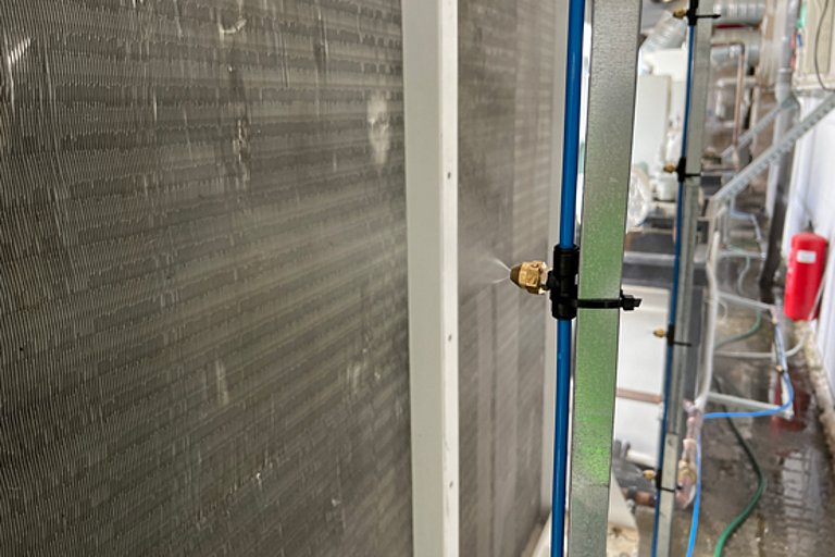 За голям производител на шоково замразени плодове и зеленчуци проектирахме, доставихме и монтирахме система от дюзи за фина мъгла, с които да омокря питите на охладителите на компресорите. Това води до понижено налягане в системата, което намалява нежеланото време за принудителен престой и увеличава експлоатационния живот на компресорите.