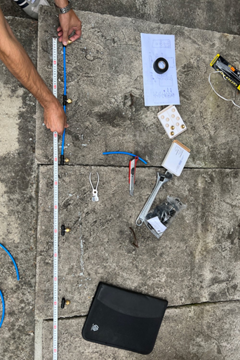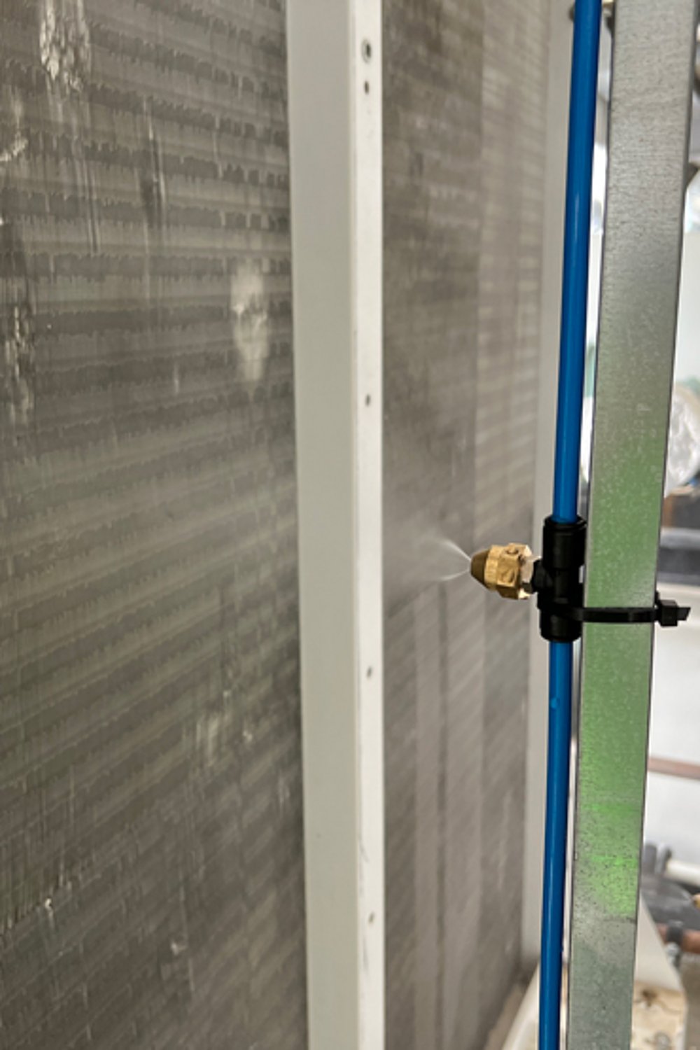 След като получихме няколко видеоклипа и снимки на сегашното положение, по подадените размери на охладителните пити направихме разпределение на дюзи за фина мъгла. Внимателно планирахме цялото трасе - от източника на вода, през трасето, монтажните фитинги, носещите рамки и закрепването им. Подбрахме дюзи с нисък дебит, стабилна струя и фина капка, които работят само с вода с налягане 2-5 bar. По този начин се осигурява бързо изпарение и отнемане на топлина от охлажданата повърхност.