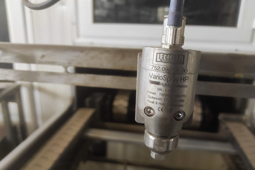 Клиентът поиска да замени ръчното полагане на яйчен меланж или глазура върху хлебни изделия с различна форма. Предложихме хидравличните системи дюзи с клапан с регулиране на ширината на импулса VarioSpray HP. Системата VarioSpray HP има диапазон на регулиране на дебита до 29:1, без да има нужда да се заменя дюзата, като същевременно се запазват непроменени ъгълът на разпръскване и едрината на капката. Системата може да бъде настроена да разпръсква на импулси, като ширината на самите импулси може да се променя и регулира.