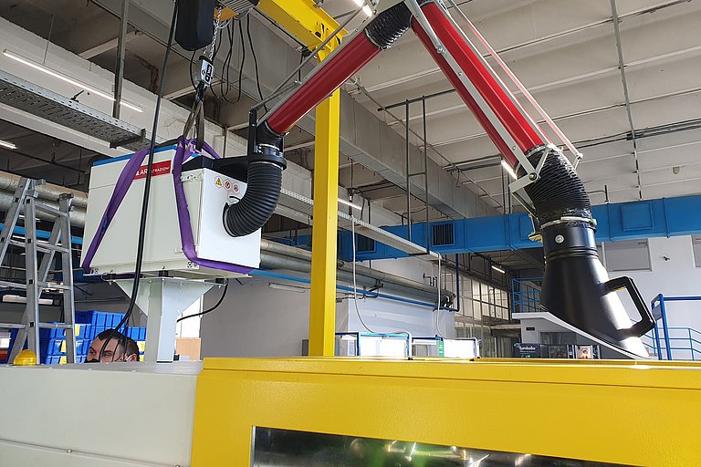 След проучване на всяка една секция детайлно и определяне на необходимите машини, които ще са с необходимия капацитет, препоръчахме на клиента монтаж на шест филтриращи системи, изцяло съобразени с работната обстановка. Върху всяка машина инсталирахме филтрираща система ARNO 1, поставена върху собствена стойка. За шлифовъчните машини изработихме специални куплунги, така че да улавят максимално генерираните пръски и прах. За шприцовете предвидихме ставен ръкав, който да се поддържа сам и да се позиционира по начин, който да не пречи на работния процес и манипулаторите наоколо.