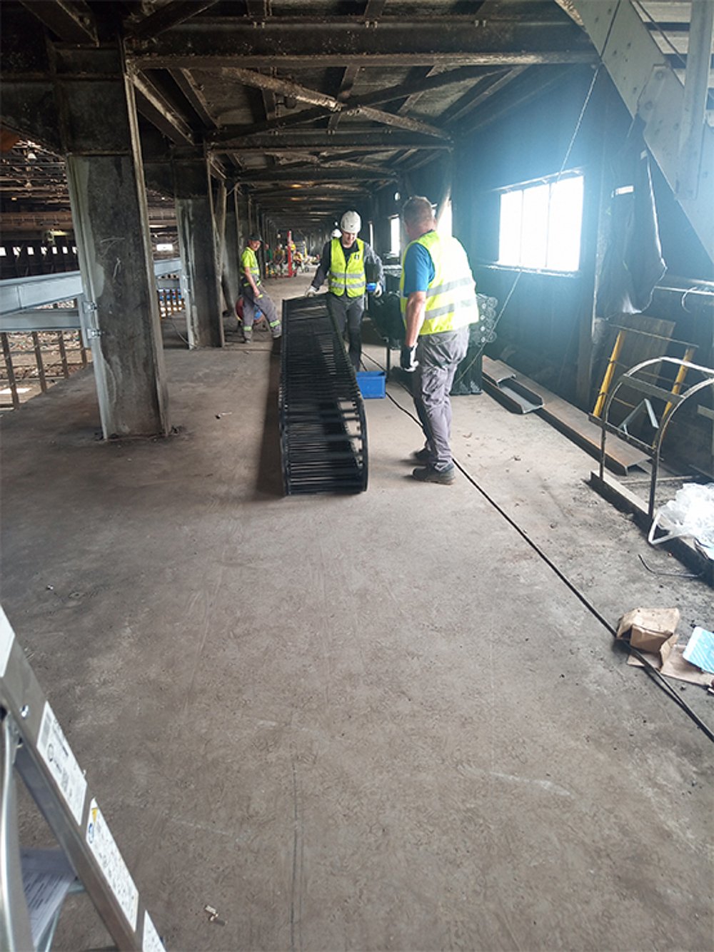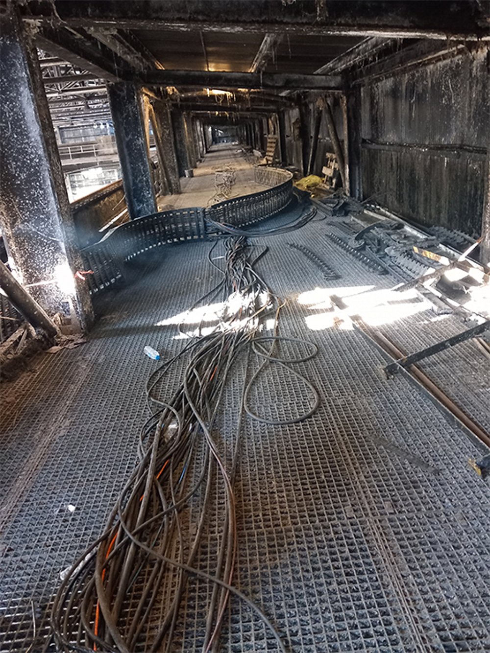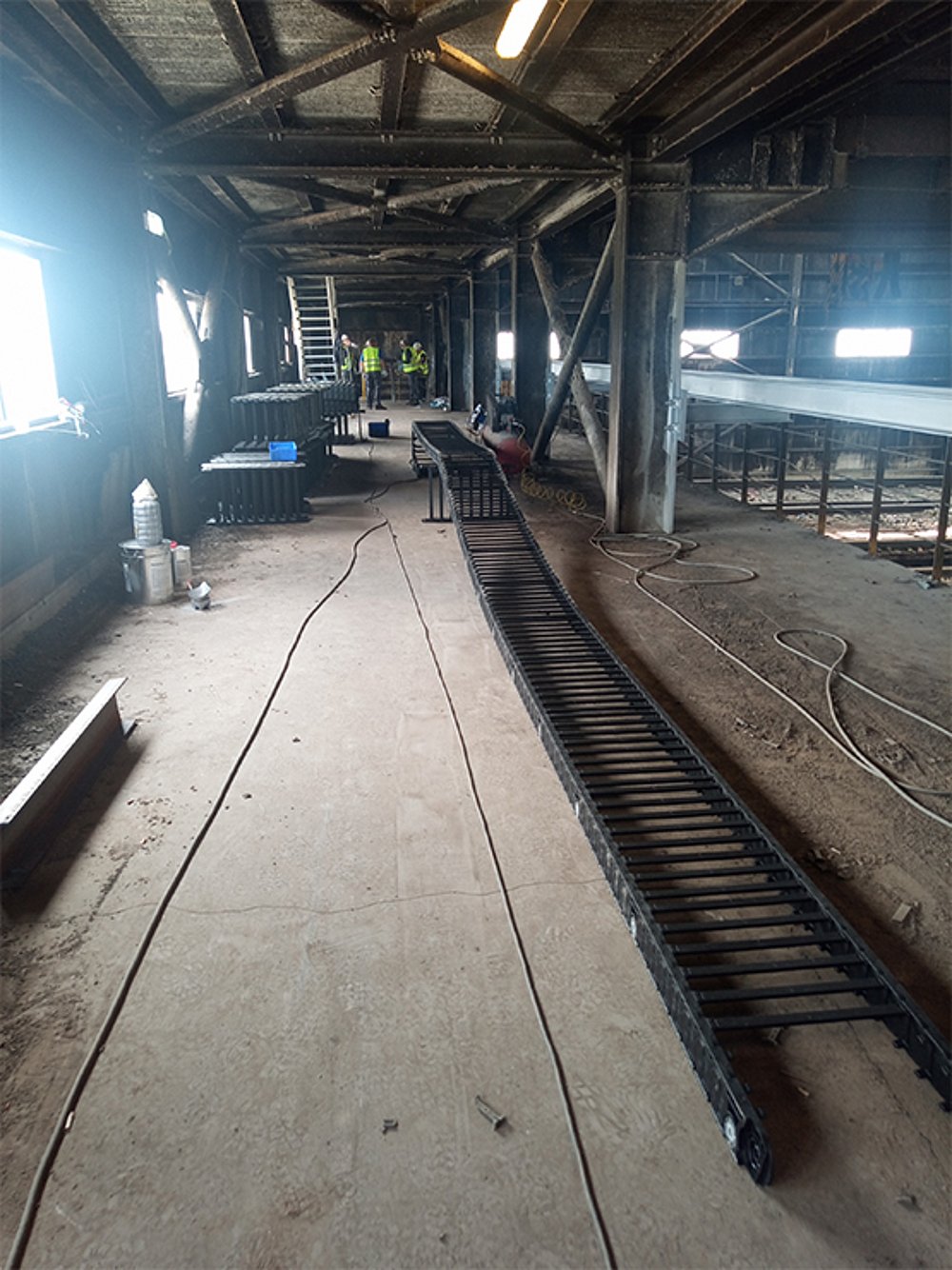 В съоръжението за биосушене клиентът разполага с два високотехнологични крана, които извършват непрекъснати операции както в ръчен, така и в автоматичен режим. Работният им ход надвишава 160 метра, а скоростта на движение достига над 100 метра в минута. Средата, в която функционират, е силно запрашена, с температура над 40°C и висока влажност – комбинация, която води до чести откази на различни машинни възли. Всеки кран е оборудван със захранващ пакет, съдържащ над 30 отделни кабела – захранващи, контролни, оптични, BUS и кабели за обратна връзка. Това представлява сериозно предизвикателство за всяка кабеловодеща система. Допълнително усложнение е, че крановете не могат да бъдат спирани за повече от 1–2 работни дни.