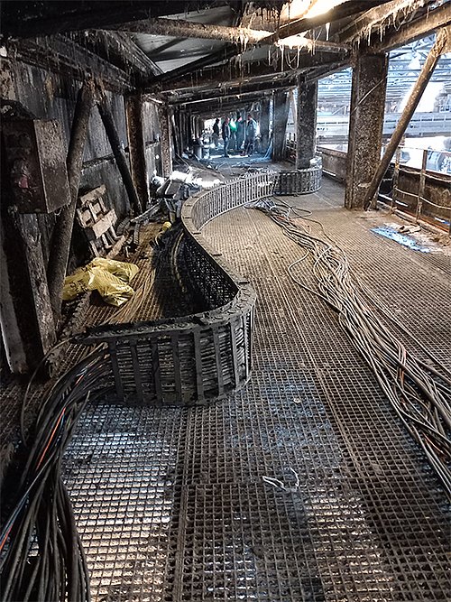 Предложихме кабеловодеща верига от серията 5050RHDAX, специално разработена за тежки натоварвания и високи скорости. Тази серия се отличава с външни ограничители на радиуса на огъване, което е ключово предимство в силно запрашена и влажна среда. При стандартните вериги ограничителите са разположени от вътрешната страна между звената, където се образуват джобове, които лесно се запълват с прах и влага. Това блокира осцилиращото движение между звената, води до увеличен радиус на огъване и може да причини издигане на веригата и изпадане извън направляващия канал. При серията 5050RHDAX външните ограничители избутват натрупания прах навън, като по този начин веригата се самопочиства. Освен това над направляващия канал е монтирана допълнителна защита против изправяне на веригата, което осигурява още една степен на надеждност при работата на системата.