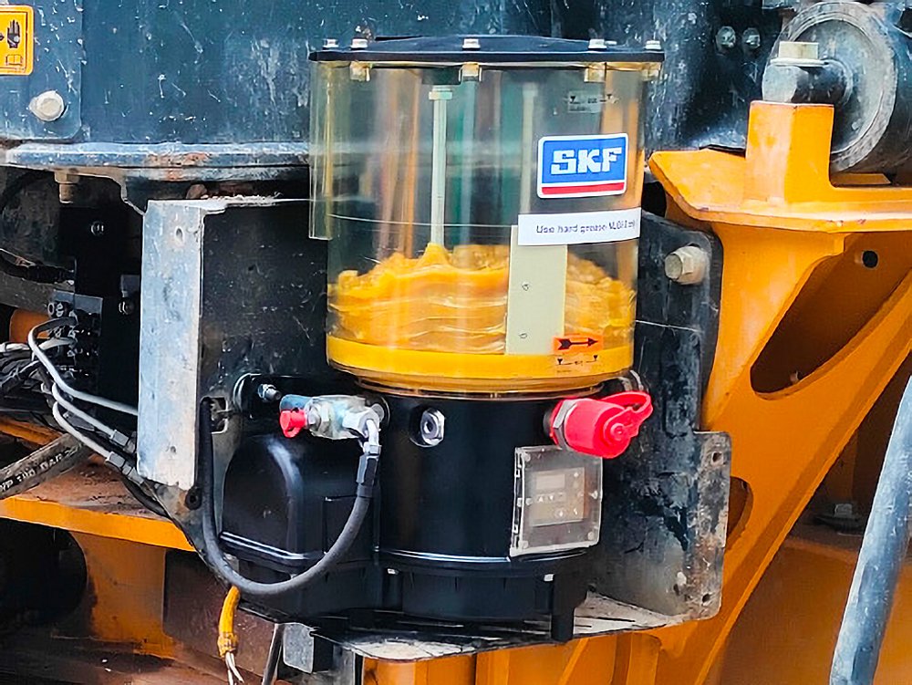 След оглед на състоянието на машината и дефектиралата фабрична система препоръчахме пълна замяна на СЦМ GROENEVELD с нова и надеждна централизирана система SKF, която е доказано подходяща за тежки строителни условия. Решението включваше частично използване на наличните здрави трасета, което оптимизира разходите за клиента, и полагане на нови линии там, където съществуващите вече не бяха годни за употреба. Монтирахме нова помпа SKF KFGS3, известна със своята издръжливост и стабилна работа при интензивни цикли. Освен това интегрирахме нови прогресивни разпределители LINCOLN SSVD, които осигуряват равномерно и контролируемо разпределение на смазката към всички смазочни точки. Комбинацията от тези компоненти гарантира по-висока надеждност, по-лесно обслужване и значително по-малък риск от бъдещи повреди на важни механични елементи.