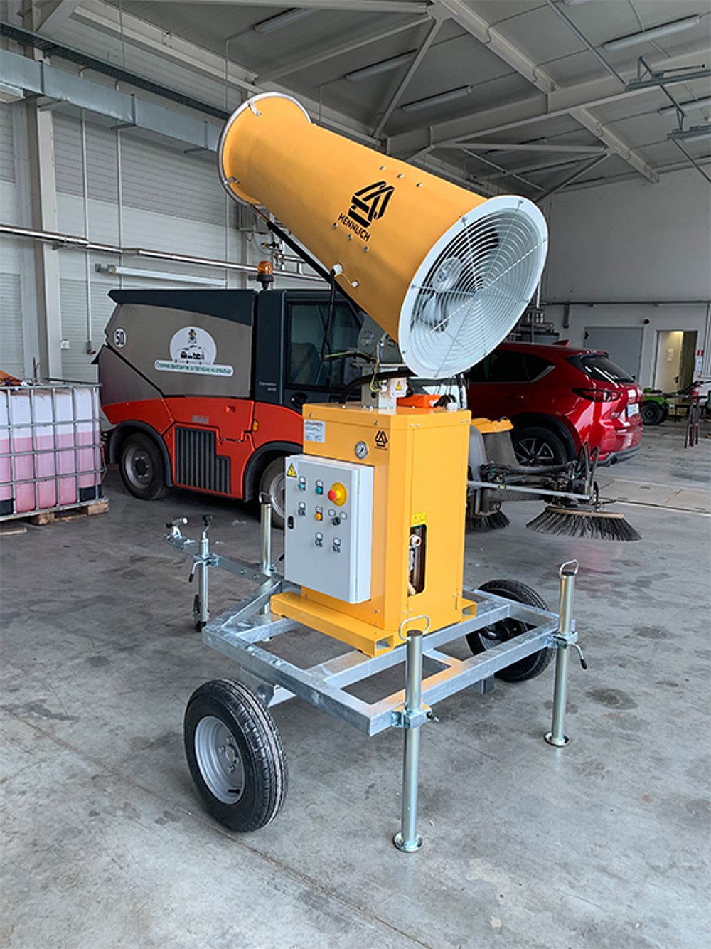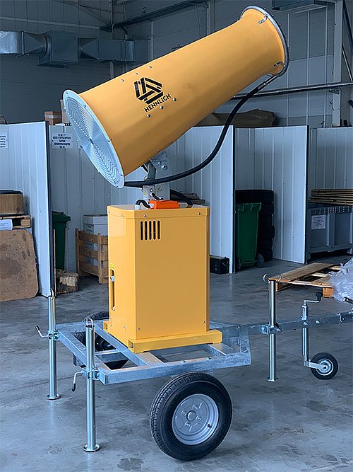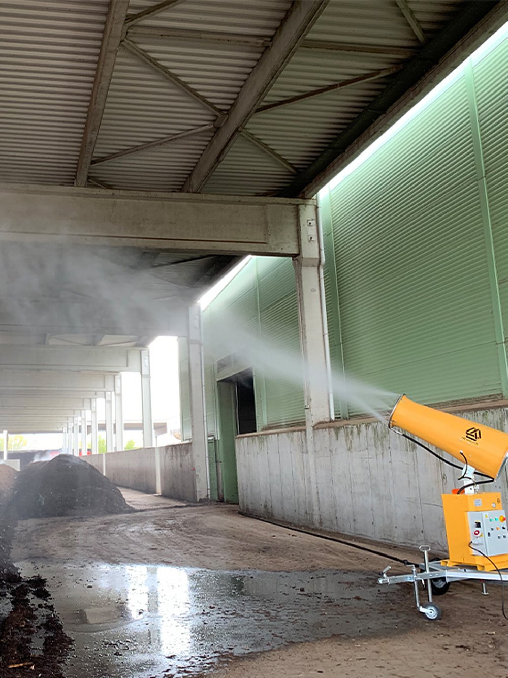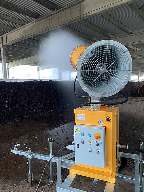В предприятие за третиране на биологични отпадъци доставихме и пуснахме в експлоатация оръдие за водна мъгла с обхват до 30 метра, което ще се използва за омокряне на растителни отпадъци. Компанията обслужва голяма територия и ежедневно обработва значителни количества биологични и твърди отпадъци, включително дървесина, което налага използването на надеждни технологии за контрол на праха и миризмите. Беше необходимо ефективно решение за овлажняване на дървесните отпадъци, с цел намаляване на запрашаването и подобряване на условията на труд в зоните за съхранение и обработка.