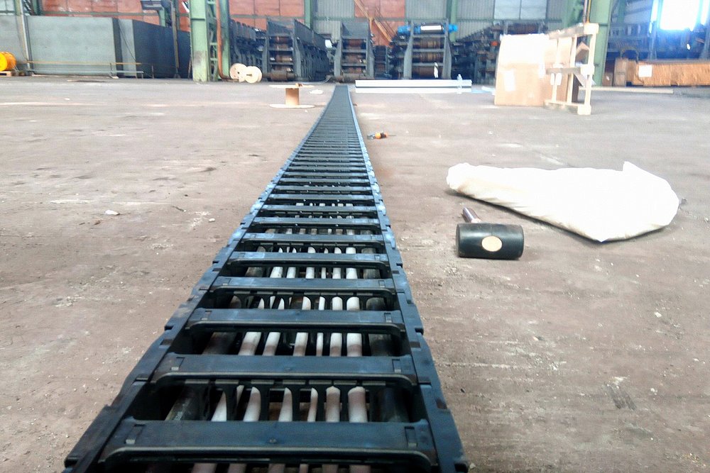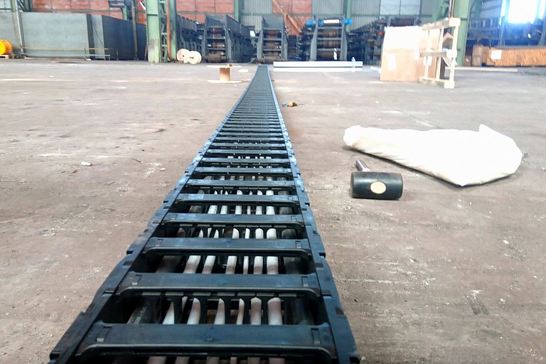 При водещ производител на стомана извършихме подмяна на фестонна захранваща система с кабеловодеща верига. Специалист от Хенлих помогна на инженерите по поддръжката в предприятието да инсталират правилно кабеловодещата система заедно с гъвкавите кабели.